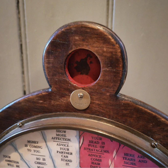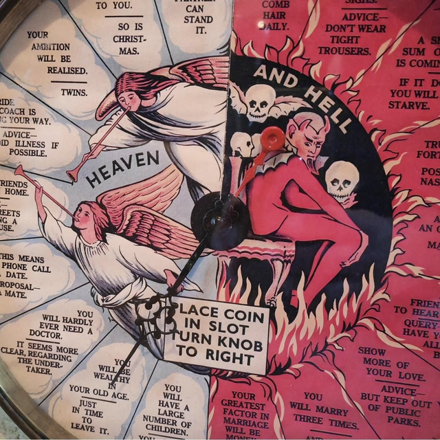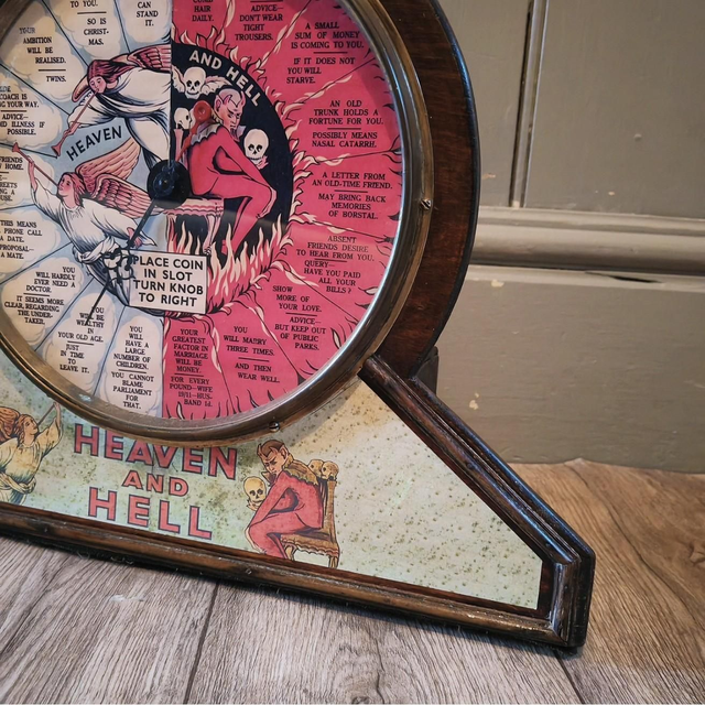 This wonderfully engaging countertop 1d penny coin-operated Heaven and Hell fortune telling machine, produced by Bollands Amusement Machine Supply Co. In a lovely oak case with a central glazed circle with half heaven and half hell sections showing fortune choices chosen by a spinning hand arrow. Fully working with many old penny's included great machine.