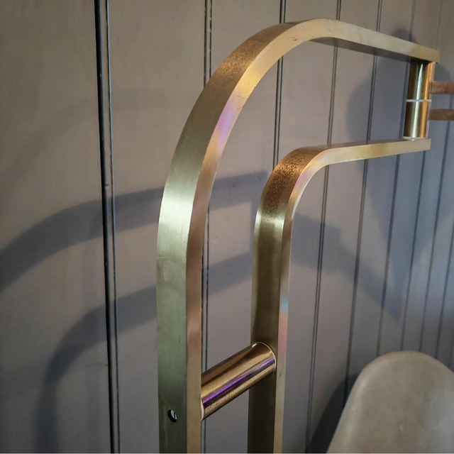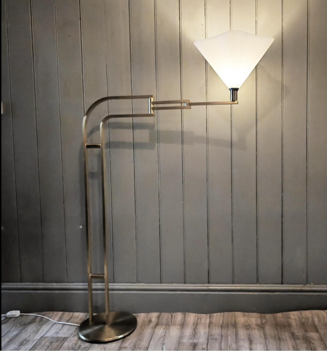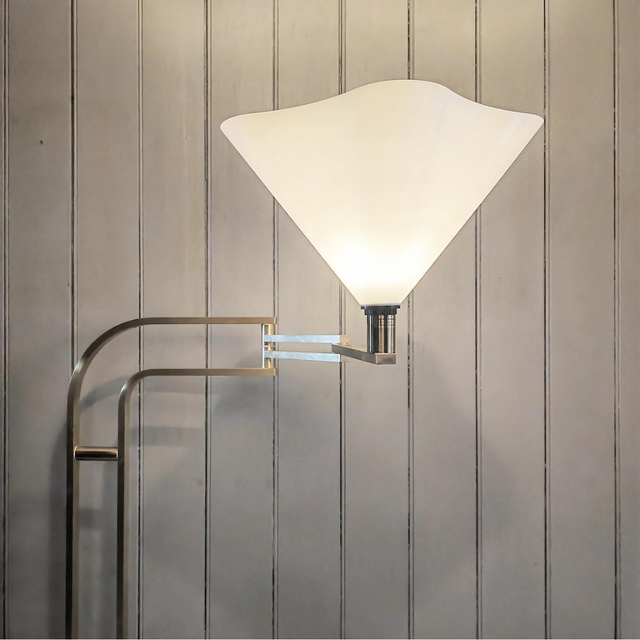 Beautiful floor lamp from the 1970s is part of a production of Italian design by Goffredo Reggiani for Reggiani. The structure is made up of a brass curving into a swing arm fully adjustable, allowing exceptional versatility in the direction of the light. The elegant and functional design is complemented by the original switch, which preserves the authenticity of the piece. Perfect for adding a touch of vintage style to any environment, this lamp represents an extraordinary example of the innovative design and quality Italian craftsmanship of the era. Stunning design.