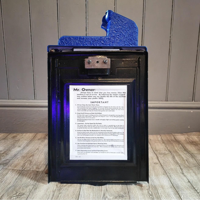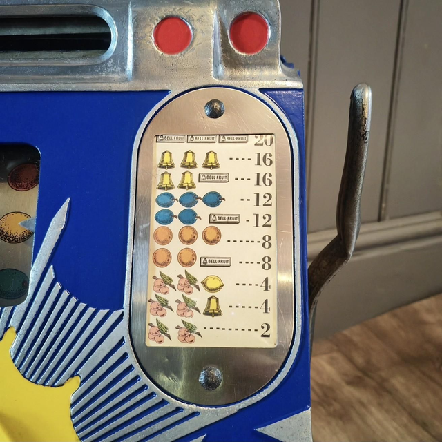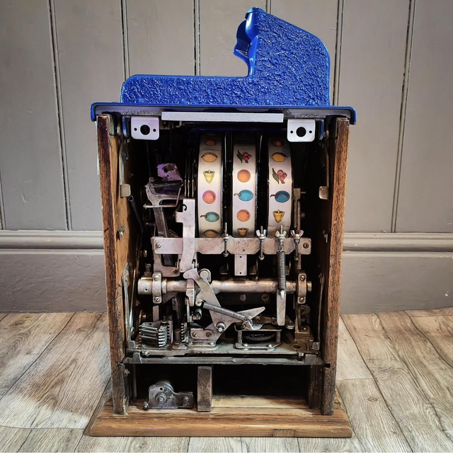 Mills Novelty Co Bursting Cherry Antique Slot Machine. This three-reel slot machine mfg in 1930s has oak wooden cabinet with a nicely restored front casting with large bursting cherry design. On uk 1D, serial number 449511(denotes blue front machine) Complete with reel strips, award card & original mills back door. Beautiful antique slot machine that plays and pays.